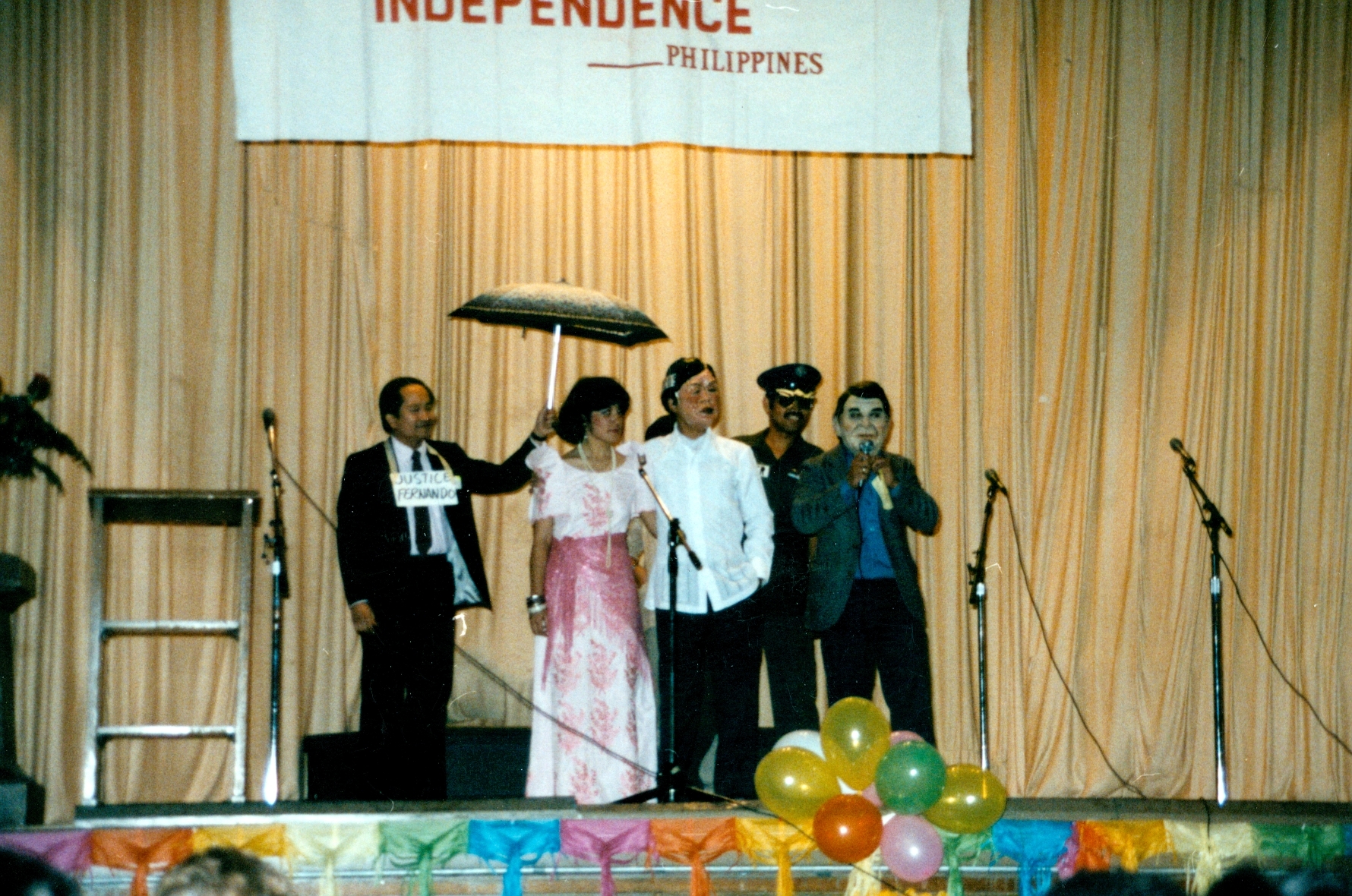 At the CAMDI national conference in August 1987 held in Oakland, CA., the Washington DC chapter presented a musical lampoon of Reagan breaking with Marcos and his repressive regime, with a rendition of “Ronald’s Way” (to the tune of Sinatra’s My Way.) The cast includes Tito Visaya as Marcos, Diana Cabcabin as Imelda, Jon Melegrito as Reagan, Ding Taverna as Fabian Ver, and Armin Alforque as Justice Fernando. By Jon Melegrito